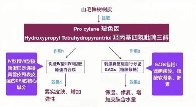 玻色因可以促进真皮层细胞加速生产IV型、VII型胶原蛋白 ,加强真皮表皮连接,使糖胺聚糖填充在IV型胶原蛋白的网络中,改善因年龄增长出现的皮肤松弛现象,进而减轻皱纹。