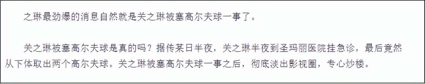 当时有人传言说,关之琳身体被塞入两个高尔夫球。由于取不出,半夜被送到香港圣玛丽医院急诊,当时关之琳脸色苍白,似乎忍受着极大的疼痛。